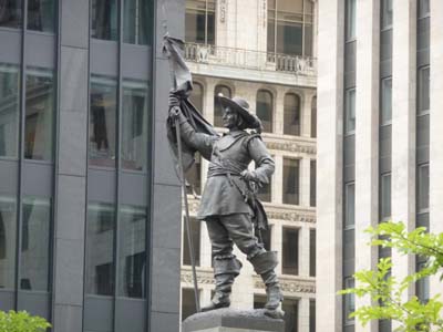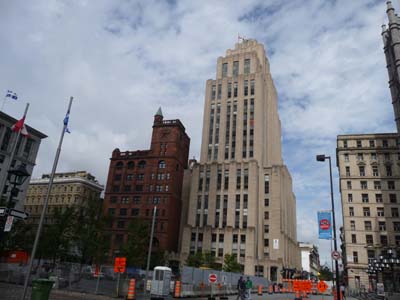 La Place d’Armes sous le commandement de la statue de Chomedey de Maisonneuve expose des monuments parmi les plus emblématiques de la ville. La Basilique Notre-Dame fut construite en 1829 sur le plan d’un architecte américain d’origine irlandaise et protestant. L’intérieur fut aménagé en s’inspirant de la Sainte Chapelle de Paris. A côté le séminaire est le plus ancien bâtiment de Montréal, il était en restauration. Deux immeubles de grande hauteur flanquent la place dont le premier construit au Canada en grés rouge et celui Art Déco. Enfin le somptueux siège de la Banque de Montréal fut construit vers 1817. |