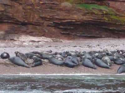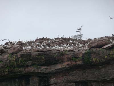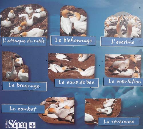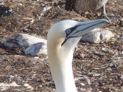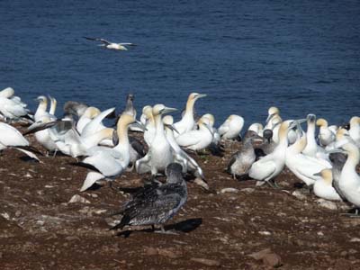 Au point de vue surplombant la colonie de Fous de Bassan un naturaliste répond aux questions ainsi j’appris que l’île regroupe environ 200.000 oiseaux de toutes espèces dont environ 105.000 Fous de Bassan. Ce bel oiseau est un extraordinaire planeur, un implant électronique a montré qu’il parcourt lors de sa migration vers la Caroline du Sud, USA, la distance en trois jours de vol de jour. Fait exceptionnel l’odeur des excréments n’a rien de pestilentielle. |