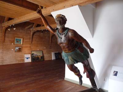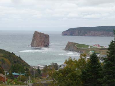 Avant de quitter Gaspé je visitais le petit musée qui présente la vie de la presqu’île de Gaspésie en quelques tableaux et l’arrivée de Jacques Cartier en 1534. Une reproduction de la Croix qu’il planta sur le rivage et un ensemble de stèles en bronze commémorant son arrivée et son dialogue avec les amérindiens sont exposés à l’extérieur. Le musée présente aussi des œuvres de Suzanne Guité, sculpteur, qui fit son tour du monde pour apprendre son art. Elle séjourna à Percé où j’arrivais en fin de matinée sous un ciel plombé. |