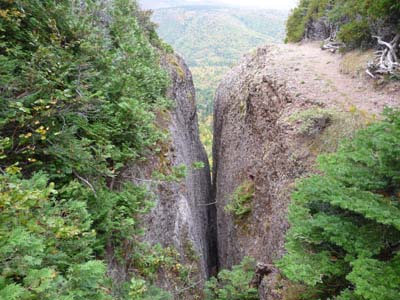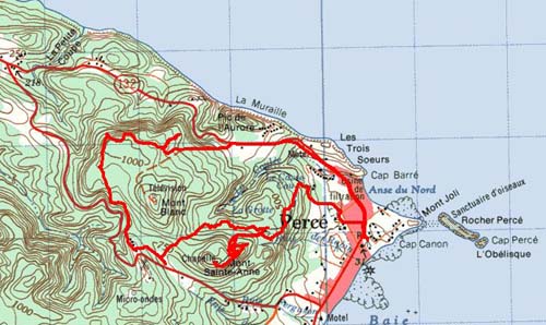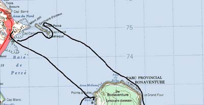 Le lendemain je souhaitais visiter la ville de Percé mais lorsque j’arrivais je constatais qu’elle était quasi déserte, beaucoup d’hôtels et restaurants étaient fermés ainsi que le musée où je ne vis qu’une sculpture de proue d’un navire non identifié. En désespoir de cause et malgré l’information du Touriste Office qui annonça 40% de chance de pluie, j’entrepris une promenade pour admirer le Rocher Percé d’en haut avec l’ascension du Mt Ste Anne à 340m d’altitude. Je parcourais les sentiers des Belvédères, des Falaises, des Sources, des Pieds Croches, de la Crevasse et de la Grande Coupe pour finalement aboutir à la Hwy #132 et un retour au parking. J’avais parcouru 12,5km GPS en ≠3:15 sans pluie. Je regrettais que le soleil ne fasse aucune apparition pour mettre en valeur le paysage marin. La randonnée a le pouvoir d’oxygéner le cerveau pour bénéficier de la plénitude de tous les sens. Ce fut encore un grand moment égoïste. Je retournais au bivouac de la veille. |