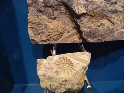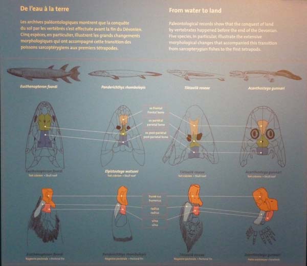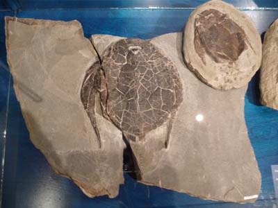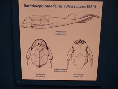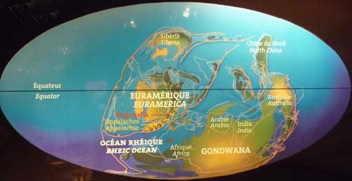 En ce samedi 08 novembre l’été des indiens a commencé pour une semaine avec des températures au-dessus de 20°C. La nature a mis ses habits d’automne avec des couleurs chatoyantes. Pour cette avant-dernière journée au Québec en Gaspésie deux visites emblématiques l’ont animées. Le Parc National de Miguasha inscrit au patrimoine mondial de l’humanité est un musée d’histoire naturelle à partir de fossiles de la période du dévonien découverts dans les falaises dès 1842. Ils ont permis aux paléontologues de comprendre comment s’est faite la conquête du sol chez les vertébrés. Les collections de fossiles tant de poissons que de végétaux sont remarquables et très didactiques pour un profane. Pour appréhender cette niche de fossiles je donne une carte de la terre à cette période, Miguasha, en rouge, était près de l’équateur en milieu favorable aux dépôts sédimentaires pour conserver la faune et la flore enfoui pendant des millions d’années. Je passais la matinée à flâner d’atelier en atelier essayant de mémoriser les explications accompagnant les spécimens. |
