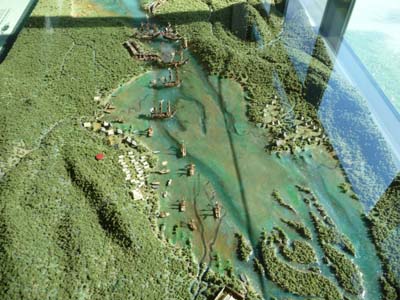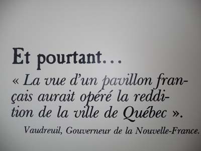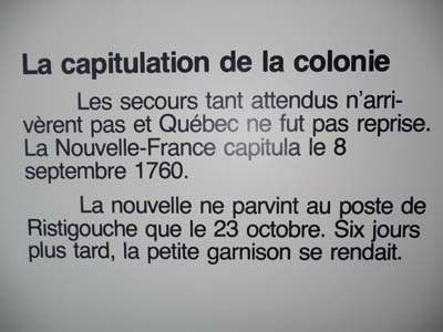Quelques kilomètres plus loin dans un autre registre le Site Historique National du Québec de la Bataille de Ristigouche présente avec des vestiges de fouilles archéologiques sous-marines sur l’épave de la frégate corsaire française "Le Machault" le dernier combat naval entre la France et l’Angleterre pour la possession de la Nouvelle-France. L’exposition reconstitue avec des débris du "Machault" l’intérieur du bateau et la vie des marins au 18e siècle parmi la vermine. Des panneaux mettent en parallèle les forces militaires en présence, l’infériorité de la marine française, puissance continentale, est mise en exergue par rapport au nombre de vaisseaux de guerre de l’Angleterre, puissance maritime. Le traité de Paris en 1763 scella l’abandon des possessions nord américaines de la France qui sera achevé par la vente de la Louisiane aux USA par Napoléon 1er pour financer ses guerres contre… l’Angleterre. Si on ne refait pas l’Histoire, force est de constater que l’Histoire est un continuum même au 21e siècle confer les problèmes de l’euro et l'attitude de l'Angleterre ! |