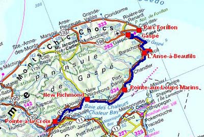 Sur le Sentier Chemin-du-Roi de retour vers l’embarcadère, je devisais agréablement avec un charmant couple de périgourdins en excursion dans la région, nous échangeâmes des souvenirs de voyage. En fin de journée le soleil fit son apparition éclairant le Rocher Percé en lumière rasante. Vers 17:30 je cherchais un bivouac que je trouvais sur une petite route de montagne menant à l’Anse-à-Beaufils. |