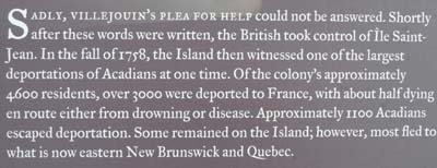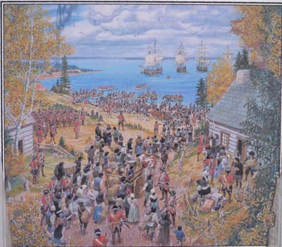 Les colons Français s’établirent dans l’Île en nommant leur campement Port-Royal (actuellement Annapolis Royal) en 1605. Le Chef Membertou de la Première Nation Mi’Kmaq devint régulièrement l’hôte de Samuel de Champlain. Les Britanniques suspicieux des bonnes relations avec les indigènes envahirent l’Île et expulsèrent les Français avec une majorité qui partit en Louisiane. En 1621 le roi James donna le territoire à Sir William Alexander qui l'appela Nova Scotia. Environ 35.000 Loyalistes venant lors de l'indépendance des USA s’installèrent dans les propriétés des Français. |