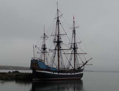 Comme la météo affichée à l’Office du Tourisme l’annonçait, il plut toute la journée. J’entrais dans le Nova Scotia, Nouvelle Écosse, à Tidnish sur la départemental Hwy #366. En route je remarquais que certaines maisons avaient des citrouilles et mannequins pour Halloween. J'avais parcouru la Sunrise Trail sous la pluie. A Pictou aucune attraction n’était ouverte, je me contentais d’une photo d’un vieux gréement à côte du Hector Heritage Quay. Pictou est le berceau de la Nouvelle Écosse. Je stationnais pour la nuit sur le quai et sous la pluie. |