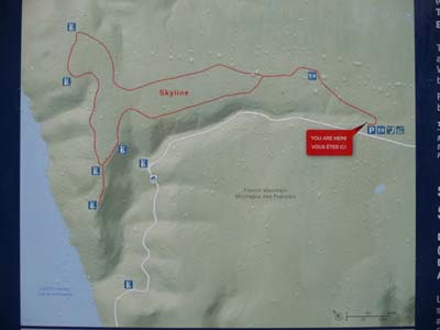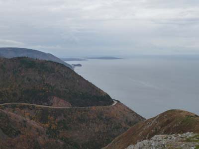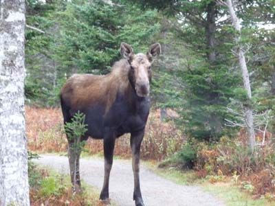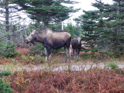 Le Parc National est réputé pour ses hautes terres et ses paysages côtiers d’une beauté spectaculaire. Il renferme une association unique d’habitats forestiers ainsi que des espèces végétales et animales. La journée était annoncée pluvieuse, aucune goutte d’eau ne tomba du ciel pourtant très sombre. Malgré tout j’entrepris deux promenades dans le Parc. Le Skyline déroule sa piste dans les hautes terres pour finir en surplomb de la côte abrupte. Au détour de la piste je me trouvais face-à-face avec un orignal et ses petits. Nous nous regardâmes avec anxiété. Le plus lentement possible je sortis mon appareil photo. Hélas ils prirent la fuite à grandes enjambés. C’est un animal étrange, pas beau, haut sur pattes et pesant très lourd, mais très agile. |