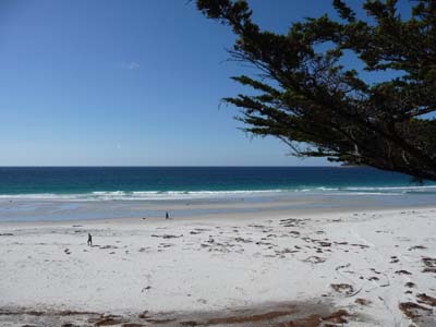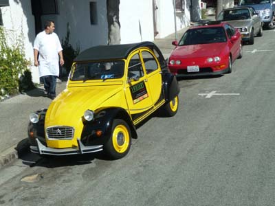 De la plaine de Santa Nella à la côte du Pacifique il y a un jet de pierre, je me retrouvais à Santa Cruz après avoir franchi les derniers contreforts montagneux par une route en zigzag. Les plages de sable blanc commencent ici mais en cette saison avec un vent froid et piquant malgré le soleil dans un ciel d’un bleu limpide il y avait peu de promeneurs. Je passais Monterey sans m’arrêter pour stationner à Carmel dont Clint Eastwood fut le maire. Là aussi les longues plages de sable blanc étaient quasi désertes. Au bord d’un trottoir je découvris du haut de mon camion un mythe français, la 2CV Citroën. |
