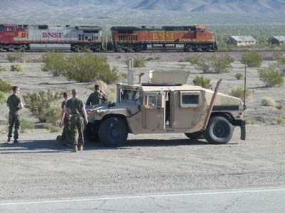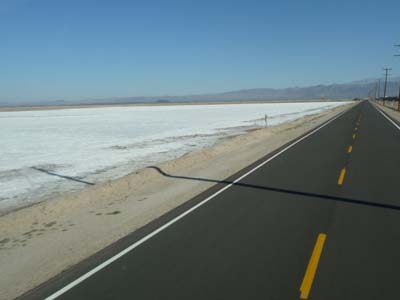 Le vendredi 11 mars en plein Mojave Desert le sel affleure le sol près du "Marine Corps Air Ground Combat Center Twentynine Palms". D’ailleurs au carrefour de la route avec l’US 66, un groupe de combat était en position. |