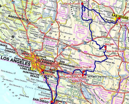 Je quittais San Diego après avoir fait l’acquisition dans câble de connexion électrique avec aux extrémités une prise de 15A femelle et une de 30A mâle aux normes US. Le trajet pour me rendre au Joshua Tree NP fut d’environ 300 km sur les Hwy 15, 215, 60 et 62 sans aucun intérêt sinon en fin de parcours une vue splendide vue sur des montagnes enneigées et sur les fermes d’éoliennes de la vallée de Palm Springs. Je décidais de rester dans le parc deux nuits pour faire une courte randonnée. |