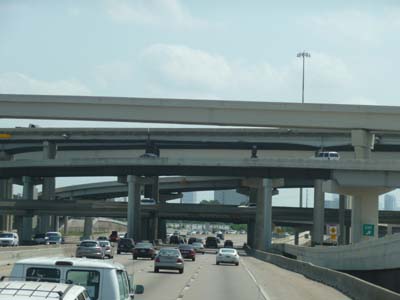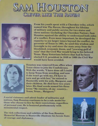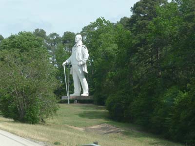 Je repris la route le jeudi 21 avril pour Dallas. De l’Interstate I45 je photographiais une statue étant de Sam Houston sans que je sache la raison de ce monument. Je m’arrêtais après Huntsville sur une aire de repos pour déjeuner. Il y avait dans un bâtiment des panneaux explicatifs de la vie de Sam Houston. Puis je roulais encore une paire d’heures pour bivouaquer à l’écart de la I45 avant d’arriver à Dallas que je visiterais le lendemain. |