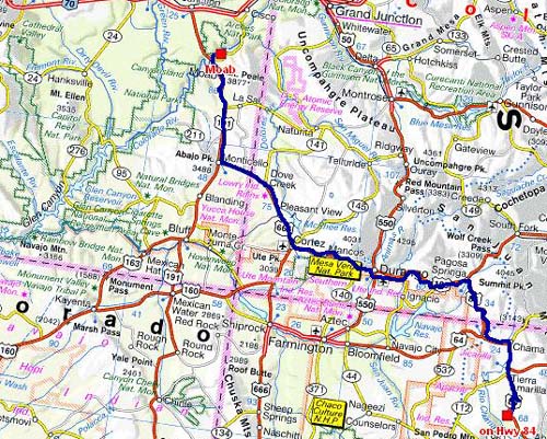Le vendredi 15 avril je commençais le voyage en trois jours de Moab, Utah, à Houston, Texas, pour acheter les quatre pneus Michelin que Salt Lake City n’avait pas été en mesure de me fournir. Je fis trois arrêts, le premier au McDo de Moab pour lire ma messagerie Internet, le deuxième au Visitor Center de Monticello pour publier les pages de mon site Internet et le dernier au Walmart de Cortez pour faire de l’approvisionnement. La route déroulait son ruban d’asphalte dans les Montagnes Rocheuses traversant des alpages et des stations de villégiatures, un paysage alpin. Je bivouaquais au campground de Echo Amphitheater. |