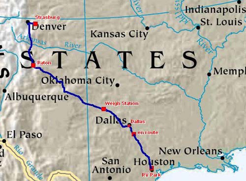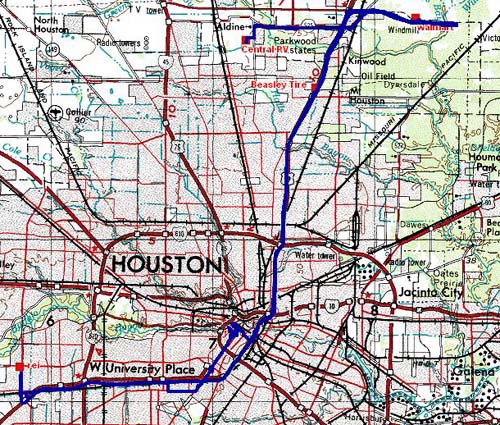 Je quittais l’aire de pique-nique avant le lever du soleil auquel j’assistais en route, splendide. Le reste de la journée fut sans intérêt sauf pour le passage à Austin où des travaux me causèrent des soucis d’orientation. Le retour du week-end fut laborieux à l’entrée de la mégalopole de Houston. J’arrivais sans difficulté au camping choisi dans le nord de la ville à proximité du vendeur de pneus Michelin. De Moab, Utah, à Houston, Texas, j'avais parcouru 2.129km en trois jours. |