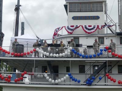 Avant midi j’étais au Pioneer Park pour assister aux discours et au concert de la fanfare de l’US Army Alaska Artic Warrior. A l’hymne national joué par la fanfare tous les assistants l’entonnèrent la main sur le cœur. Le parc regroupe des cabanes en rondins et un cabaret de l’époque de la ruée vers l’or. Je déjeunais d’un hot-dog et d’un apple pie très américain. |