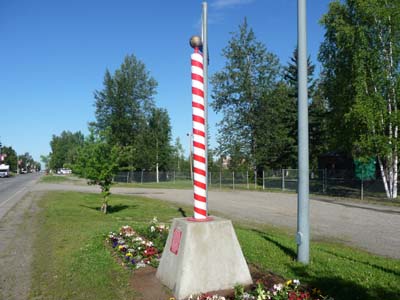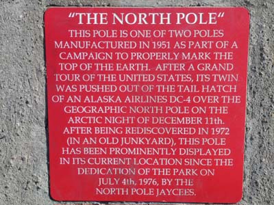 Je quittais Fairbanks par l’Alaska Hwy #2, en route je fis trois visites. D’abord un petit détour pour jeter un œil au village où habite Santa Claus, North Pole qui n’est pas au pole nord. Il reçu l’un des deux piliers largué d’avion au pole nord puis récupérer et installé ici. |
