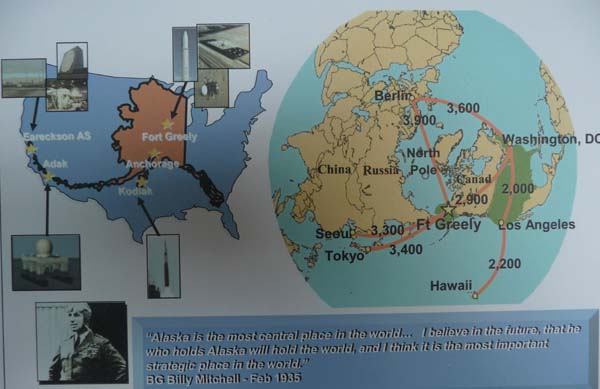 Mais à l’étage du Visitor Center je découvris une photo intéressante montrant l’intérêt stratégique de l’Alaska qui entraîna la construction récente du Fort Greely où sont entreposés des missiles. |