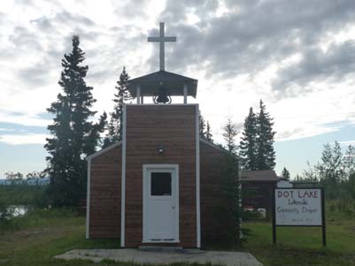 Peu après mon bivouac je m’arrêtais pour admirer la rustique chapelle de la communauté de Dot Lake avec à l’intérieure une tapisserie naïve de "La Cène". |