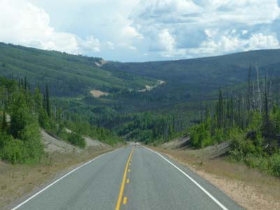 Je quittais mon dernier bivouac en Alaska vers 7:30 Alaska Time pour être à l’ouverture de la frontière à 9:00 Pacific Time, car il n’y a pas de contrôle au poste des USA mais dix mètres plus loin au poste du Canada. Le douanier parlait français, un vrai bonheur, de plus il fut d’une remarquable gentillesse, loin de la morgue des douaniers US. Après les habituelles questions dont il s’excusa il m’accorda un visa de six mois à ma demande, durée dix minutes. La "Top of the World Highway" méandre sur les croupes des montagnes à une altitude comprise entre 1000 et 1100 mètres dans des paysages verdoyant de grande beauté. Une longue descente de 14 kilomètres conduit au George Black Ferry pour traverser le Yukon River en face de Dawson City. Au Canada Je retrouvais avec satisfaction le système métrique… |
