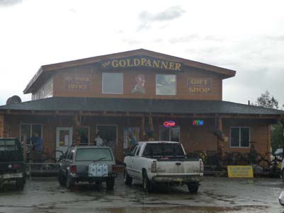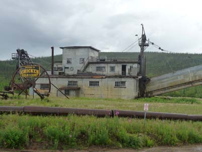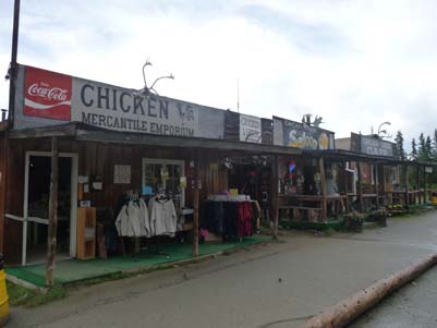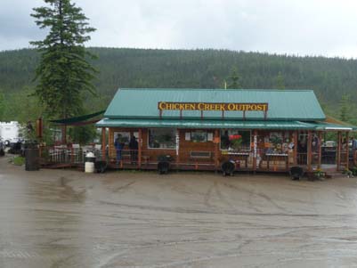 Chicken fut un village de mineur bien avant la ruée vers l’or de la région de Klondike, sa population fut au maximum de 400 âmes. Maintenant elle est d’environ cinquante personnes l’été et six l’hiver ! En réalité ce n’est plus un village mais un ensemble de boutiques et de campings pour attirer le chaland, le camping-cariste, voyageur des temps modernes avec un vaisseau tout confort requérant une connexion électrique de 50A. Cette initiative est due à la très avisée femme d’affaire, Susan Wiren. En grimpant la Taylor Hwy le temps se dégrada je terminais sous la pluie et dans les nuages. Autant dire qu’en descendant du camion je pataugeais dans la gadoue. Je fis le tour des boutiques puis je me réchauffais d’un café américain en consultant ma messagerie à la vitesse d’un train de sénateurs. Je quittais ce lieu sans grand intérêt pour bivouaquer sur la route de gravier. |
