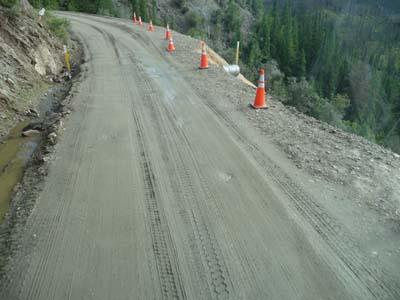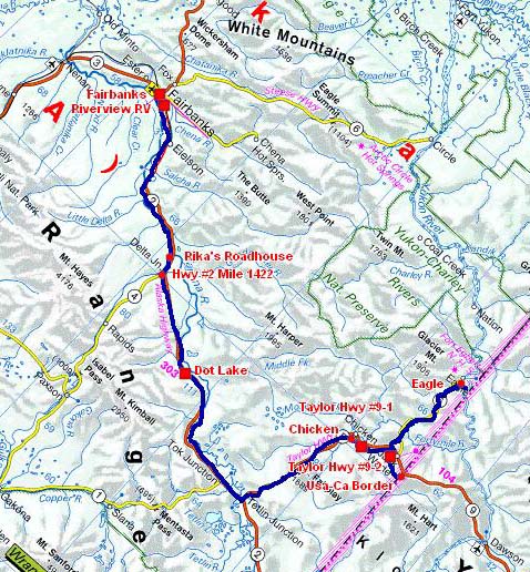 Pour aller à Dawson City dans le Yukon, Canada, je décidais de prendre la Taylor Hwy #9 qui devient une route de gravier de mauvaise réputation à partir de Chicken, sinon il faut continuer vers le sud sur l’Alaska Hwy #2 jusqu’à Whitehorse, Yukon, Canada, puis vers le nord par la Klondike Hwy #2 jusqu’à Dawson soit un très long détour. |