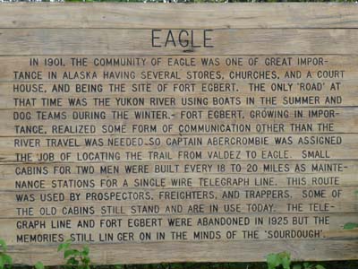 A Jack Wade Junction je continuais sur la Taylor Hwy #9 jusqu’à Eagle l’ancienne ville minière sur le puissant Yukon River. Moses Mercier établit Belle Isle comme comptoir de commerce sur le Yukon River en 1880. De l’or fut découvert à Fortymile River en 1886, à Circle en 1893 et à Klondike près de Dawson en 1896. La position stratégique d’Eagle en fit le centre de transport, de commerce et de communication pour le Yukon Territory du Canada et pour l’intérieur de l’Alaska. La ville fut créée officiellement en 1897. En 1898 la population était de 1700 personnes vivant dans plus de 500 cabanes et tentes. Aujourd’hui ce n’est pas tout à fait une ville fantôme, mais un charmant village comme il en existe dans tous les pays du monde avec des vestiges du passé restaurés ou non. D’ailleurs la piste herbeuse pour les deux ou trois avions de la communauté montre l’intense activité économique. |