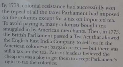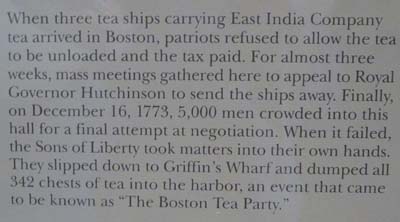 Le Massachusetts joua un rôle important dans l’histoire des USA. Au 18e siècle les colons se révoltèrent contre les restrictions commerciales imposées par l’Angleterre, la révolte fut réprimée par le Boston Massacre en 1770. En 1773 le Boston Tea Party fut le déclanchement du processus d’indépendance de la Nouvelle Angleterre, son origine fut une nouvelle taxe sur le thé imposée la puissance coloniale. |