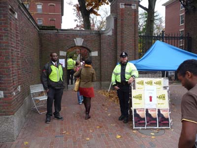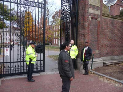 En route je longeais les grilles du Harvard Yard dont les portes étaient sévèrement gardées par des vigiles et policiers, pas question d’entrer sans laissez-passer dans ce haut lieu de formation du capitalisme américain. |
