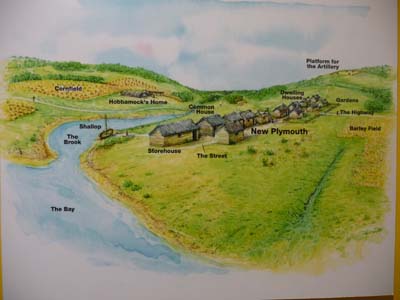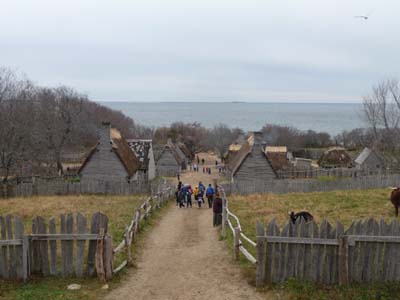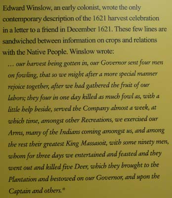 Parti en fin de matinée de Middleborough j’arrivais vers midi à Plymouth à la recherche du site de débarquement des Pèlerins en 1620, Plimoth Plantation. Le musée reconstitue sur un vaste terrain un village des natifs, Wampanoag, le village des Pèlerins et, un centre d’artisanat et boutique. Le musée est consacré à l’origine du Thanksgiving qui ne daterait pas des Pèlerins, lire l’extrait ci-dessous, mais du milieu du 19e siècle, à rechercher sur Internet à l’aide des moteurs. |