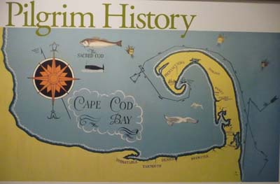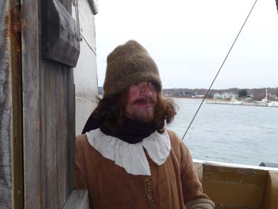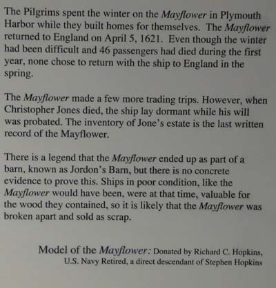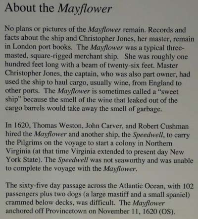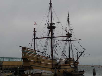Au centre de Plymouth sur le Waterfront la réplique du Mayflower qui transporta les 102 Pèlerins avec 30 membres d’équipage. La vie pendant le voyage fut très pénible dans la promiscuité. Le temps se dégrada accompagné par une baisse de température et une pluie glaciale. |