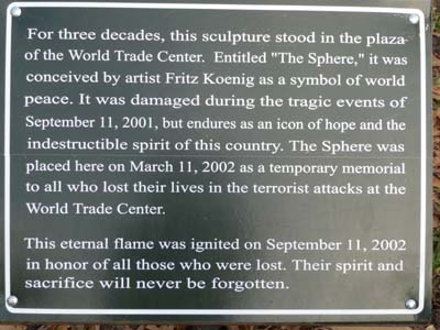 La région de New York City –NYC– comprend cinq arrondissements de plus de 18 millions d’habitants, Manhattan, le plus touristique, le Bronx, Brooklyn, le Queens et Staten Island. La première journée fut une journée du souvenir, September 11, 2001 et l'Holocauste conséquence de l'intolérance et de son corollaire le fanatisme. |