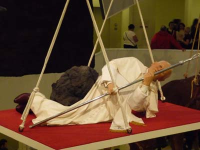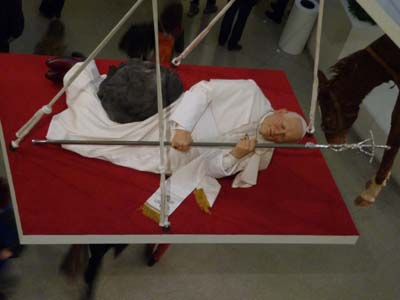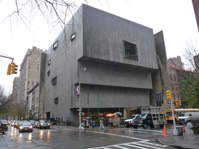 Le mercredi fut une journée de pluie passée dans deux musées sur le "Museum Mile" que j’atteignis avec le Path puis le métro. Solomon R. Guggenheim Museum se singularise par une architecture mondialement connue. La rotonde entourée de la spirale ascendante est occupée par une gigantesque composition des œuvres du sculpteur Mauricio Cattelan appelée "All" Ce sont des mannequins de cire d’humains et d’animaux pour la plupart sans titre mais en situation donnant sens. Il décrit son œuvre des années 1980 à 1990 comme étant : "Au sujet de l’impossibilité de faire quelque chose…au sujet de l’insécurité, de l’échec." Il fut marqué par sa jeunesse à Padoue, l’exposition est perturbante. Les annexes du musée sont consacrées d’une part au Pop art des années 1950 avec Roy Lichtenstein, Claes Oldenburg et Andy Warhol, à Painting with White Border de Kandinsky et à la Thannhauser Collection centrée sur des œuvres d’artistes français. Mis à part M. Cattelan la photographie était formellement interdite, mais… |
