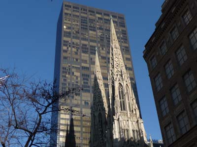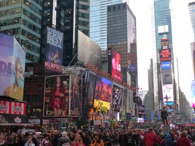 Par une belle et froide journée je flânais dans Midtown le long de la Fifth Ave avec quatre arrêts majeurs. New York Public Library dont la façade de style Beaux Arts est encadrée par deux Lions appelés Patience & Fortitude. L’entrée est quasiment sans contrôle je me promenais dans les salles de lecture dont la superbe Main Reading Room au troisième étage. La connexion WiFi est dans toutes les salles de lecture. Grand Central Station construit en 1913 n’est plus le terminal des trains mais celui du métro et du commuter. Le plafond de la salle des pas perdus a été décoré avec une vue du ciel étoilé la nuit. En ce jour il y avait foule attendant l’ouverture de l’Apple Store, de nombreux policiers étaient présents ainsi que des soldats patrouillant par deux. Les deux magnifiques tours de St Patrick’s Cathedral se reflétaient dans un immeuble proche. Times Square en ce vendredi était noire de monde avec des animations pour attirer le chaland. |