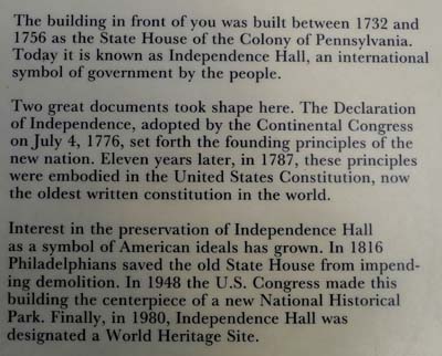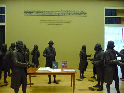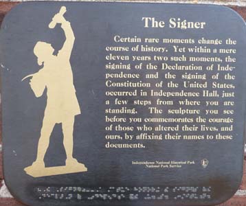 A Boston j’avais mis mes pas sur le Freedom Trail, ici à Philadelphie je les mis dans ceux des Pères Fondateurs des États-unis d’Amérique. Là encore je parcourus une page de l’histoire de la nation naissante racontée dans le Parc National Historique de l’Indépendance. Philadelphie est le berceau d’une nation. Le symbole le plus emblématique est la cloche qui était suspendue dans le State House en 1753. Elle fut appelée Liberty Bell en 1830 par un groupe anti-esclavagiste. Puis elle se fêla en 1846. L’ensemble des bâtiments qui jouèrent un rôle pendant et après la naissance de la nation est distribué dans un parc en forme de "L" Ils furent soit rénovés soit reconstruits. Je les visitais tous dès lors qu’ils étaient accessibles. Bien sûr une citation d’Alexis de Tocqueville figure en exergue dans la salle de la Cour Suprême. Le point focal du parc est le National Constitution Center qui raconte l’histoire de la Constitution, ses Amendements, son rôle, son immuabilité, et son interprétation par les Présidents. Hélas un administratif technocrate a interdit de prendre des photos, seuls les statues en bronze des signataires peuvent l’être. |