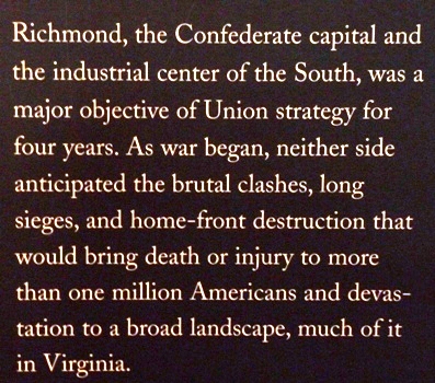Le lundi matin j'allais à la découverte de Monument Blvd, large boulevard avec une esplanade centrale et des ronds-points avec des statues en l'honneur de héros locaux tels Robert E. Lee, Jefferson Davis, Arthur Ashe et d'autres. Hélas le soleil était dans le dos des statues ! Avant de quitter Richmond je visitais l'American Civil War Center at Historic Tredegar je découvris, parfois je suis naïf, les horreurs de la guerre. Les sudistes avaient inventé, certainement les premiers au monde, les mines sous-marines et anti-personnelles. Comme ils avaient inventé le premier navire de guerre en acier. Il est remarquable d'ailleurs que le nombre de morts et de blessés fut plus important dans l'armée nordique. La ville de Richmond fut quasiment détruite. |