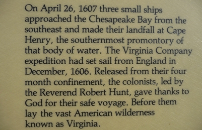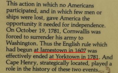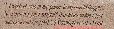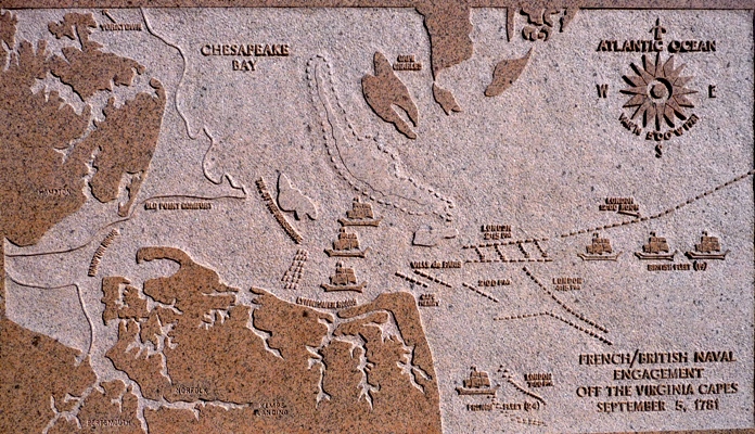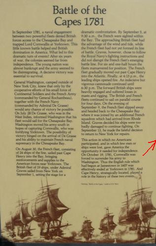 Virginia Beach, la ville la plus peuplée de l'état, possède une plage de sable longue de 35 miles. En ce jour ensoleillée et venté une poignée de touristes se promenait sur le bord de l'océan au pied des immeubles de béton. Atlantic Ave s'étend derrière sans vue sur l'océan. Au nord au-delà de la 83rd St deux postes de garde contrôlent l'entrée du parc historique. Mon passeport français facilita les formalités, ouverture de la cabine, de la cellule et des coffres, ce fut bon enfant, je reçus un laissez-passer. Au retour je saluais d'un appel de phare auquel les policiers répondirent aimablement. Avant d'atteindre le site où fut fondé Jamestown, les colons débarquèrent à Cape Henry pour faire de l'eau et du bois, leurs premiers pas dans le nouveau monde en 1607. Plus de cent soixante dix ans plus tard une bataille navale mit fin à la Guerre d'Indépendance. Elle opposa 24 navires de guerre français à 19 navires de guerre britannique. L'engagement commença le 4 septembre 1781 et dura quatre jours. La flotte anglaise fut durement endommagée, elle retourna à New York. Le 19 octobre 1781 Cornwallis, sans secours, se rendit à George Washington dont le génie militaire fut de saisir la venue de de Grasse pour prendre l'armée de Cornwallis dans la nasse de Chesapeake Bay en ordonnant à La Fayette de la poursuivre et en abandonnant son projet de prendre New York pour faire marche vers le sud avec l'armée de Rochambeau. Cette bataille décisive est peu connue, Paris n'a pas de Chesapeake Square. |