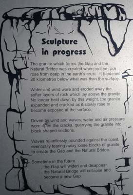 Le premier février je quittais Cosy Corner par une belle matinée ensoleillée pour visiter le Torndirrup NP, l’un des parcs en front de mer du WA le plus visité. En effet il recèle quelques belles curiosités naturelles, le Natural Bridge, voir la Galerie de photos, The Gap et Blowholes. Le plus spectaculaires fut le Natural Bridge dont l’érosion continue et les spécialistes prévoient, dans quelques millions d’années, sa destruction pour devenir un chenal comme The Gap. Les Blowholes font entendre par intermittence un bruit de trompe lorsque la mer s’engouffre violemment dans les grottes souterraines. La Frenchman's Bay offre à voir un paysage remarquable. |
