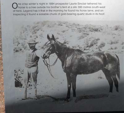 En 1894 Laurie Sinclair attacha son cheval à un arbre. La légende dit que le matin il a trouvé son cheval boiteux, et en l'inspectant il a découvert un important morceau de quartz contenant d'or coincé dans le sabot. |