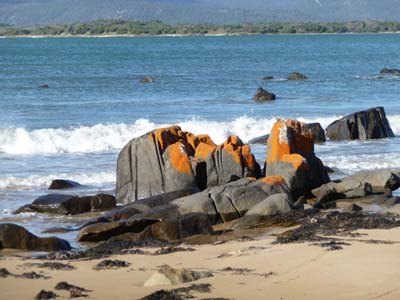 En ce dernier jour en Tasmanie je flânais pour atteindre Devonport en passant par le merveilleux plan d’eau du lac Barrington dédié à l’aviron. Puis ce fut les maigres topiary de Railton, le platypus géant à Latrobe et enfin les derniers rochers couverts de lichen rouge à Port Sorell, à l’embouchure de la Rubicon River. Je me présentais à l’entrée de l’embarcadère du Spirit of Tasmania à 17 heures pour embarquer à 18.30 avec un départ effectif à 19 heures. L’arrivée à Melbourne était prévue le lendemain matin à 6 heures. Cette dernière journée fut heureusement sans pluie mais avec un soleil automnale et un froid intense. |