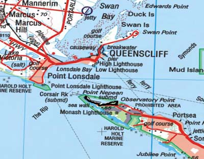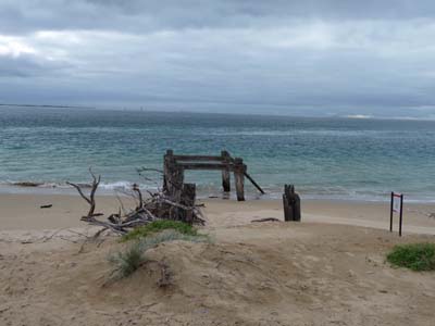 Puis je me dirigeais vers Portsea à la pointe de Mornington Peninsula. Je trouvais un bivouac peu avant Sorrento au bord d’une plage, le littoral est occupé par des résidences secondaires. Le temps était toujours couvert avec une pluie fine et une température de 18°C. |