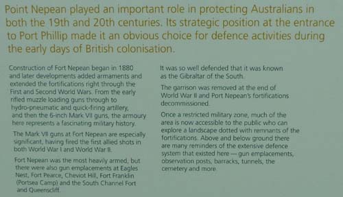 Puis je parcourais une courte randonnée de 7,6 km pour visiter le Point Nepean où se trouve le Fort éponyme qui protégea Port Phillip et Melbourne lors de la deuxième guerre mondiale. Les vestiges sont impressionnants et les panneaux informatifs sont très éloquents. |