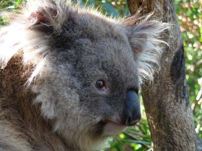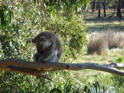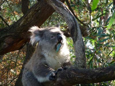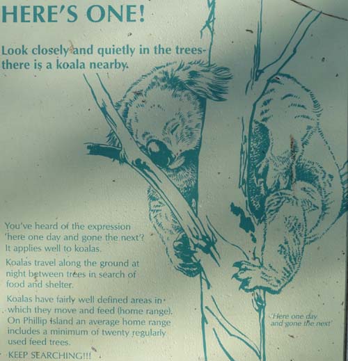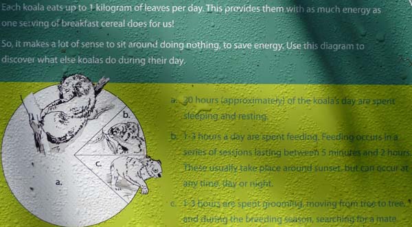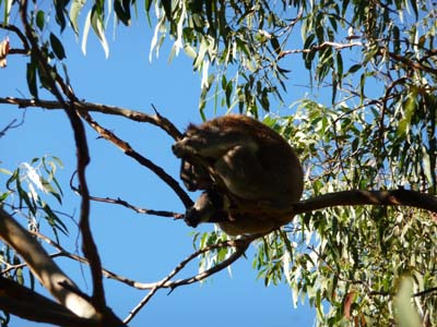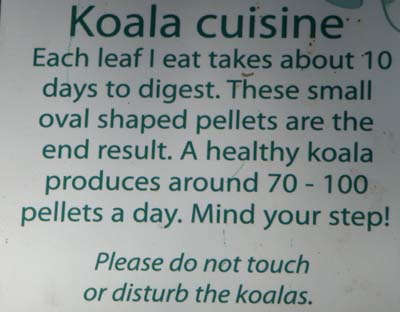 Je passais la fin de la matinée du dimanche 16 mai au Koala Conservation Centre qui présente la vie du koala dans tous ses états, rien ne nous est épargné, jusqu’à ses crottes très sèches car il ne boit pas. Contrairement à ce que laisse supposer son nom scientifique en latin, ce n’est pas un ours mais un marsupial. Je parcourais la promenade en planche surélevée à sa découverte dans les eucalyptus, son habitat et son alimentation –son biotope–. Je vis plus d’une dizaine de spécimen qui, sauf un, dormaient. Ce dernier s’alimentait. |
