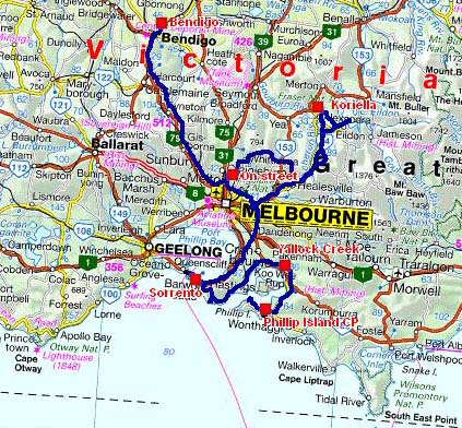 Le 12 mai fut une journée de tourisme dans les montagnes sous la pluie avec un détour pour voir le lac artificiel de Eildon derrière une très haute digue. En route je passais par Marysville qui fut totalement détruite lors d’un incendie de forêt. La reconstruction était encore encours. Je retournais à Melbourne pour trouver des amortisseurs de la marque Koni, car l’importateur est situé dans la banlieue. Je le trouvais en début d’après-midi et lui commandais le jeu complet que je devais prendre le lendemain. Je retournais au bivouac de Campbellfield. |