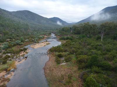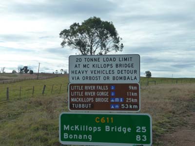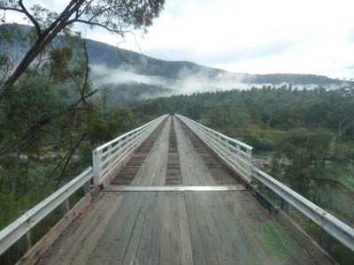 Le lendemain je quittais le bivouac pour franchir le pont limité à 20tonnes, pas de crainte le camion est bien en deçà. Toutefois les planches me rappelèrent certains ponts en Mongolie. Puis ce fut la descente vers Orbost, la route était une gravel road parfois asphaltée dans une vallée très étroite. |