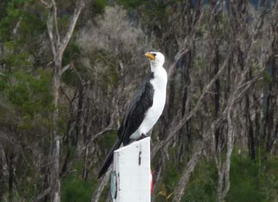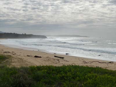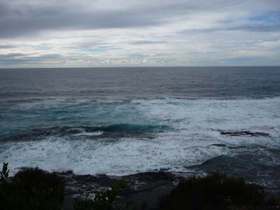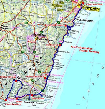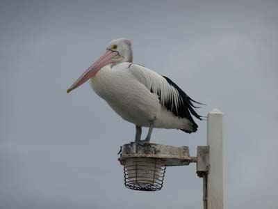 Le lendemain avant de quitter l’État du Victoria je me détournais pour voir le lac de Mallacoota dont je fis le tour, hélas hormis des pélicans toujours perchés sur des réverbères, il n’y avait rien à voir en cette basse saison. Le franchissement de la frontière du New South Wales se passa sans contrôle sanitaire. Eden fut la première ville rencontrée de ce nouvel état où je récoltais des brochures touristiques. J’établis le bivouac au nord de Merimbula. Ce fut une journée sans intérêt et sans pluie. |