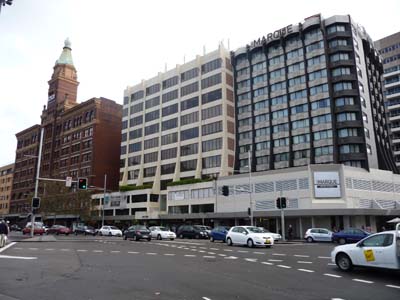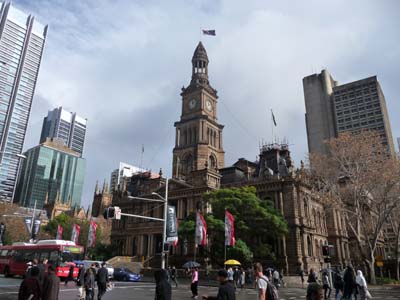 La première journée à Sydney fut consacrée à des démarches administratives : aller chercher un colis de pièces de rechange au GPO Poste Restante qui n’était pas encore arrivé, aller au consulat de France pour l’obtention d’un nouveau passeport, l’actuel n’ayant plus de page vierge, aller au service d’immigration pour instruire l’obtention d’une prolongation du visa actuel avec deux entrées, impossible et aller aux consulats des futurs pays à visiter. Je parcourus plusieurs fois George Street dans le City Business Centre -CBD-. Chemin faisant entre deux éclaircies de bourrasques je pris quelques photos. Des immeubles modernes sans grâce jouxtent des bâtiments du 19ème siècle, l’hôtel de Ville émerge entre des tours de verre, le Queen Victoria Building -QVB- trône en majesté au centre du CBD dont Pierre Cardin aurait dit : Le plus beau shopping centre du monde ! |