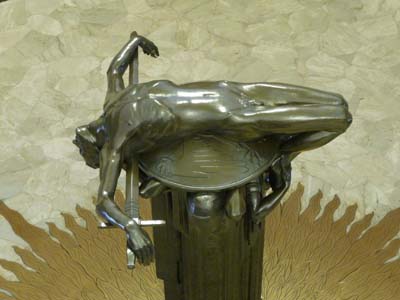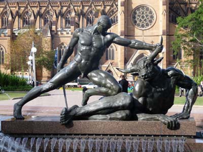 Deux monuments retinrent mon attention dans Hyde Park, l’Archibald Fountain pour commémorer l’association de l’Australie et de la France pendant la Première Guerre Mondiale et la statue de bronze de l’Anzac Memorial, un corps allongé sur un bouclier et crucifié sur une glaive symbole du sacrifice des soldats de l'Australie et de la Nouvelle-Zélande pendant la Deuxième Guerre Mondiale. |
