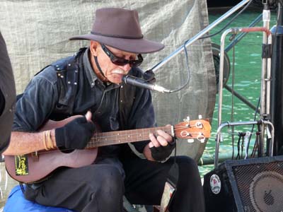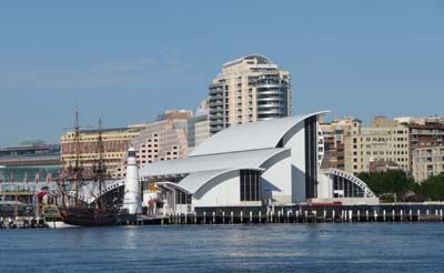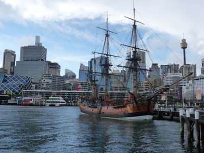 Le lendemain fut une journée copieusement arrosée par des embruns venus de la mer par rafales. A peine quelques éclaircies pour animer les photos ; le ciel fut constamment couvert de nuages noirs. Courageusement je retournais à Darling Harbour pour visiter l’Australian Maritime Museum. Je découvris quelques pièces intéressantes, par exemple une barque de pêche aborigène qui préfigure la planche de surf et cocorico toute une vitrine dédiée à la French Connection de La Pérouse en 1785 disparu en mer en 1788 à Bruni d’Entrecasteaux en 1791 et à Baudin en 1801 mort du typhus en mer. Ces expéditions furent uniquement à but scientifique comme j’ai eu l’occasion de l’écrire lors de mon tour de la Tasmanie. |