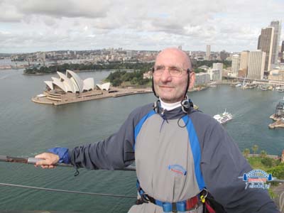 L’ascension du Harbour Bridge construit dans les années 1924 à 32 n’est pas une aventure comme l’ascension d’un 6.000 mètres dans l’Himalaya. Il faut passer un test d’alcoolémie, revêtir une combinaison, ceinturer un harnais avec un mousqueton attaché à un câble tout au long de la promenade, aucun risque, rien n’est laissé au hasard. Les affaires personnels sont enfermées dans un coffre sécurisé, pas d’appareil photo, elles sont vendues à la fin du parcours qui dure environ 3h30 séance de déshabillage et rhabillage comprise. Le coût est de A$198 et le CD de quatre photos A$55,95, c’est un Big Business. La vue du sommet de l’arche sur la baie de Sydney est inoubliable, extraordinaire. |