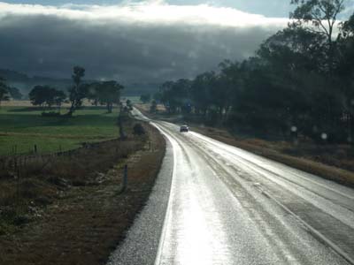 Le lendemain fut une journée de route sans curiosités marquantes. Je m’arrêtais pour déjeuner à Glen-Innes où je fis du shopping et où je consultais ma messagerie. Toujours à environ 1200 mètres d’altitude je bivouaquais sur une aire de repos dans les nuages. |