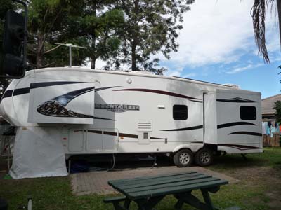 L’objectif de ce samedi fut de repérer dans la banlieue sud de Brisbane la localisation du garage MAN-Western Star à Wacol et de bivouaquer à proximité en cas de nécessité notamment avant l’expédition du camion vers la destination future à partir du port de Brisbane. Le camping le plus proche est à Durack. Près du camion stationnait l’une des caravanes la plus longue en Australie appelée 5th Wheelers car il s’agit d’une semi-remorque dont l’attache est la cinquième roue portée soit par un pick-up appelé Ute soit par la plateforme d’un petit camion du type Iveco Daily. Brisbane est au 27° de latitude sud soit 10° au nord de Melbourne, la température en cette saison hivernale y est plus clémente. |