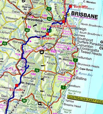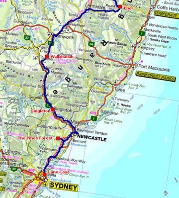 Le dimanche 13 juin je quittais Sydney après deux semaines d’arrêt. La Pacific Hwy vers Brisbane serpente en montagnes russes taillées dans la roche. Pour cette première journée de route le soleil était toujours présent et les automobilistes nombreux se dirigeaient soit vers la mer soit vers la montagne. Je souhaitais un bivouac tranquille dans la Pines Forest, hélas les habitants de Sydney s’y étaient donnés rendez-vous. |